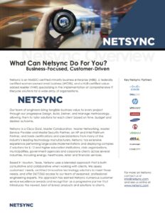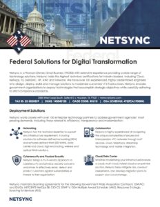 Netsync is an end-to-end technology solutions consulting company that helps public and private organizations implement complex IT projects to achieve exceptional outcomes. Our team of engineers bring tangible business value to every project they design and deploy through our progressive Design, Build, Deliver and Manage services methodology, which allows them to craft customized solutions for each client based on time, budget and desired outcomes.